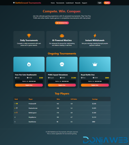 The app includes a header with navigation, hero section, features, tournament listings, and a leaderboard. The design is modern and follows current trends in gaming tournament applications.