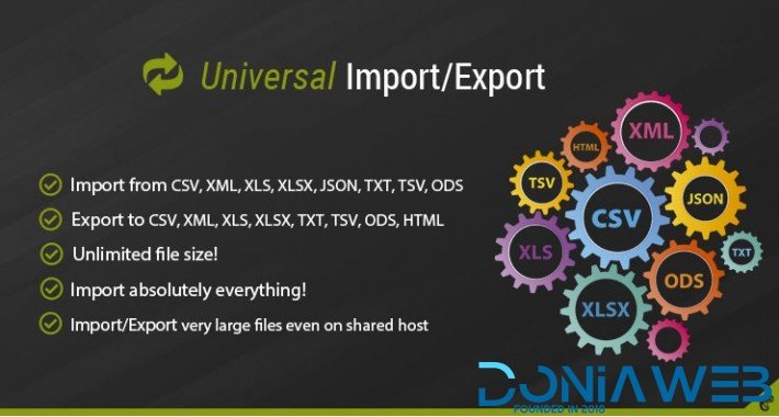 This module will allows you to import or export easily lists (as products list, categories list, etc) from CSV, XML, XLS, XLSX, JSON, TXT, TSV, or ODS files. It is very easy to use and the file size is unlimited :import very big data set, export unlimited number of products !