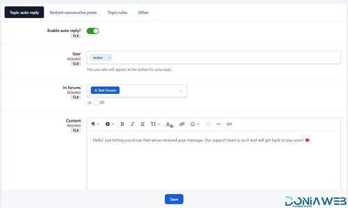 โ ย Auto Replyย โ Automatically respond to new topics with a predefined message, perfect for support forums to confirm message receipt.